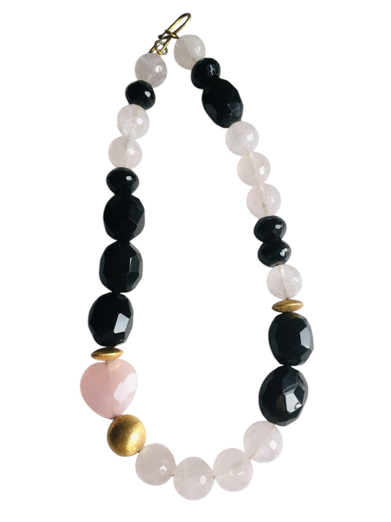 Facetert Halskjede I Onyx og Rosenkvarts. Lås og detaljer i forgylt sølv, tredd på vaier, lengde 50 cm.